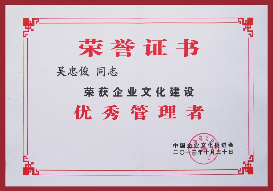 集團(tuán)公司被授予“企業(yè)文化建設(shè)百佳單位”榮譽(yù)稱號(hào);集團(tuán)公司總經(jīng)理、黨委書記吳忠俊被第四屆七次理事會(huì)選為中國(guó)企業(yè)文化促進(jìn)會(huì)副會(huì)長(zhǎng),并被評(píng)為“企業(yè)文化建設(shè)優(yōu)秀管理者”;集團(tuán)公司企業(yè)文化策劃處處長(zhǎng)俆世革被評(píng)為“企業(yè)文化建設(shè)先進(jìn)工作者”。我司在企業(yè)文化建設(shè)方面的成績(jī)得到了充分肯定。