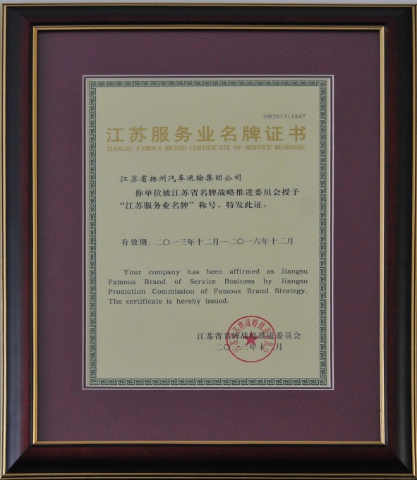 近年來,公司積極貫徹省政府關于加快現(xiàn)代服務業(yè)發(fā)展的要求,大力實施文化與品牌發(fā)展戰(zhàn)略,始終堅持把爭創(chuàng)企業(yè)名牌、推進揚汽品牌發(fā)展作為一項系統(tǒng)工程來抓,堅持品牌建設與品牌經(jīng)營相結合,提升“揚汽品牌”的市場知名度,促進企業(yè)健康穩(wěn)定持續(xù)發(fā)展。2013年在申報江蘇服務業(yè)名牌工作過程中,公司依據(jù)《江蘇省名牌產(chǎn)品管理辦法》規(guī)定,圍繞企業(yè)領導、戰(zhàn)略、顧客與市場、資源、過程管理、測量分析與改進以及經(jīng)營結果等七個方面考評內(nèi)容進行系統(tǒng)申報,自2013年7月開始,歷時數(shù)月,經(jīng)嚴格篩選最終當選。