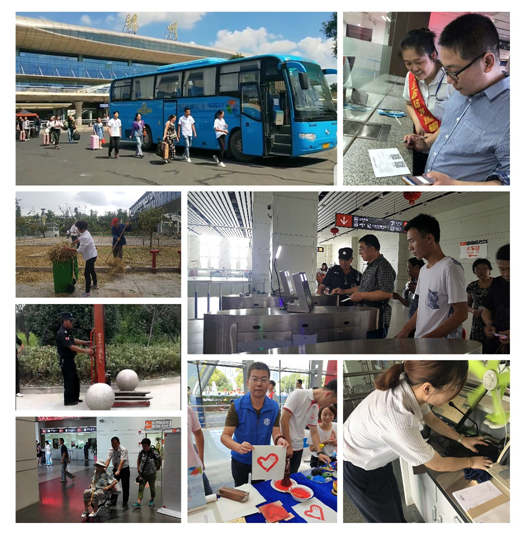車(chē)站各班組分工協(xié)作打掃各自責(zé)任區(qū)域,清掃工作臺(tái)、參加"志愿服務(wù) 美好你我他"第三屆江蘇志愿服務(wù)展示交流活動(dòng)、清掃路邊綠化帶、噴灑藥水、除雜草滅蟲(chóng)害、整理通道入口、設(shè)備設(shè)施維護(hù)、消防安全檢查、身份實(shí)名驗(yàn)證、檢查危險(xiǎn)禁運(yùn)物品、檢查客車(chē)安全帶、為特殊旅客提供一站式服務(wù)、熱情引導(dǎo)購(gòu)票、候車(chē),征詢(xún)旅客意見(jiàn)、開(kāi)展問(wèn)卷調(diào)查,以整潔的站區(qū)環(huán)境、良好的精神風(fēng)貌和優(yōu)質(zhì)的候乘服務(wù)當(dāng)好東道主,文明迎盛會(huì)。