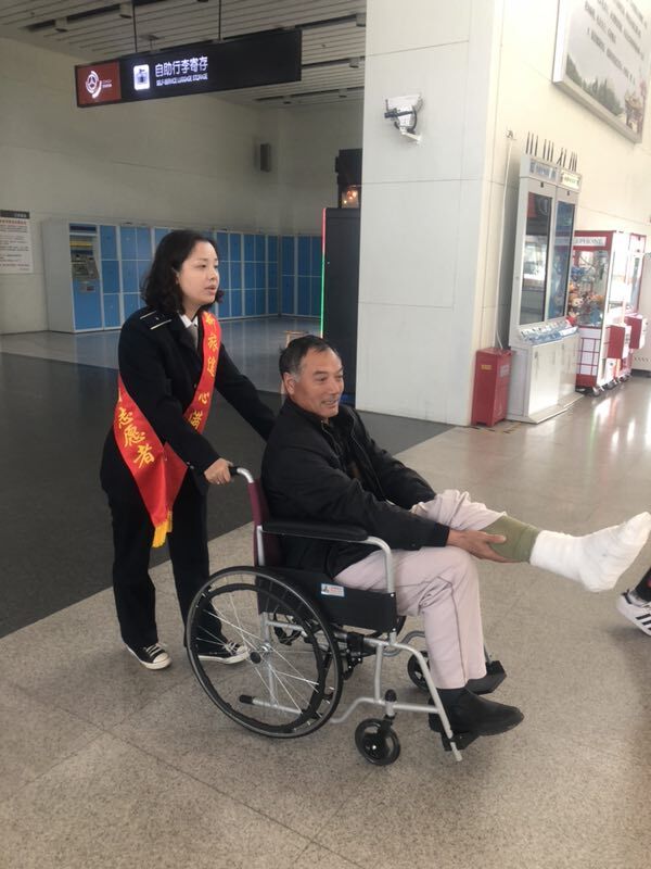 不一會兒,陪同的工友買好了當天10:30分前往昆山的車票。高娟和另一位工作人員彭素青借來了輪椅,二人推著他來到了二樓發(fā)車檢票口,將他攙扶到座椅上坐好,并和發(fā)車班工作人員交接了尤師傅的情況,囑托他們多多照應,安排好一切后,高娟和彭素青才離開回到自己的工作崗位。尤師傅和工友都非常感謝揚州站工作人員細心周到的服務。