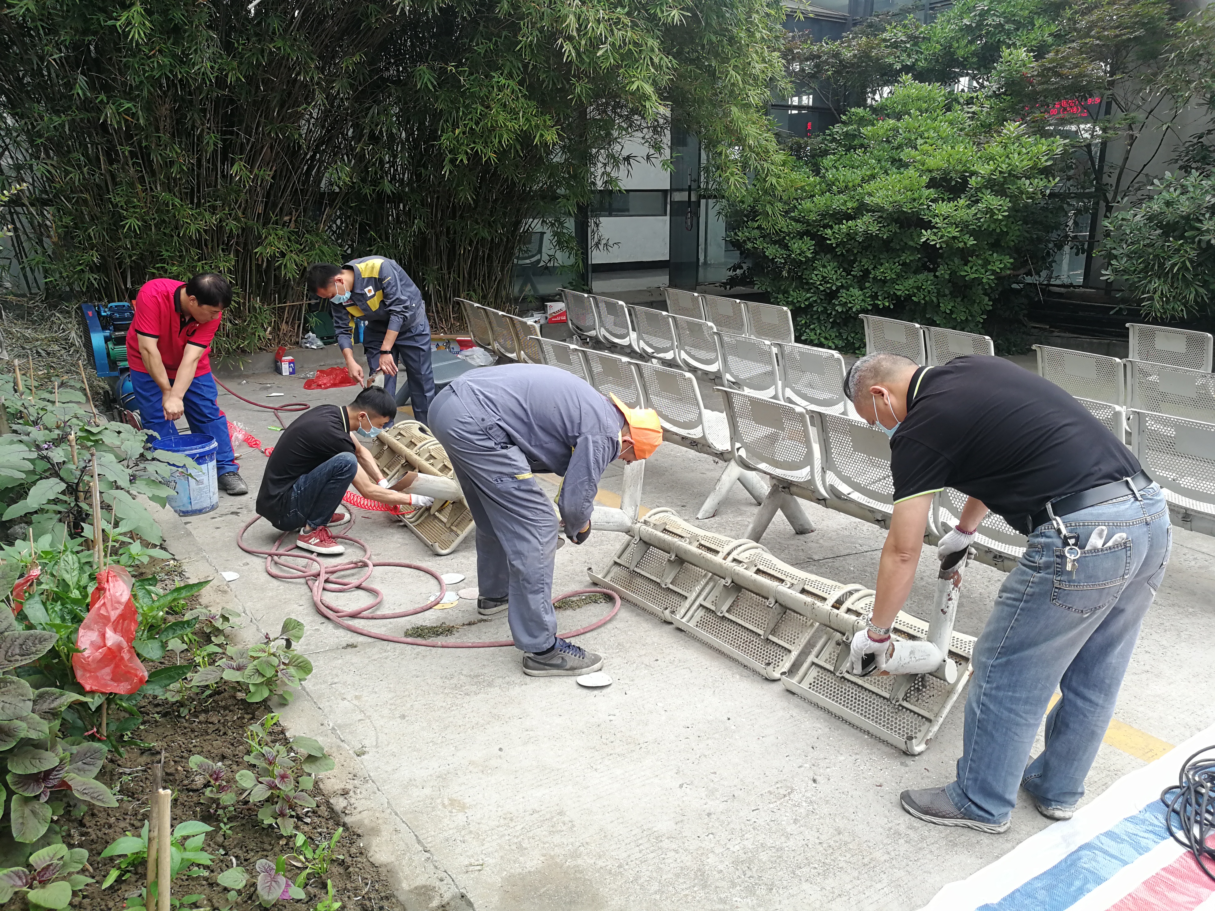 修理廠在接到江都分公司的任務請援,指派江都維修點,抽調總廠黨員骨干成立12人的突擊隊執(zhí)行這項任務。5月31日至6月1日兩天,從早上7點到晚上7點,突擊隊按照計劃分工明確,分成兩支隊伍同時進行,江都維修點負責座椅搬運、打磨、水洗、噴漆、歸位等系列工作,修理總廠負責車輛通道設計、標識、噴字以及停車位劃線任務。
