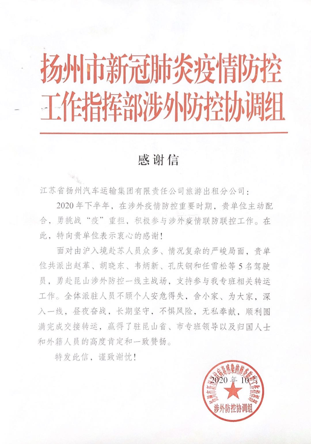 十月下旬,一封承載著市疫情防控指揮部贊譽的感謝信送至旅游出租分公司。疫情防控指揮部對第二批參加境外返揚人員轉(zhuǎn)運工作的五名駕駛員給予了高度評價,信中表示,他們在昆山涉外防控一線,長期堅守,晝夜奮戰(zhàn),不懼風險,無私奉獻,順利圓滿完成交接轉(zhuǎn)運,贏得市專班領(lǐng)導以及歸國人士和外籍人員的高度肯定和一致贊揚。