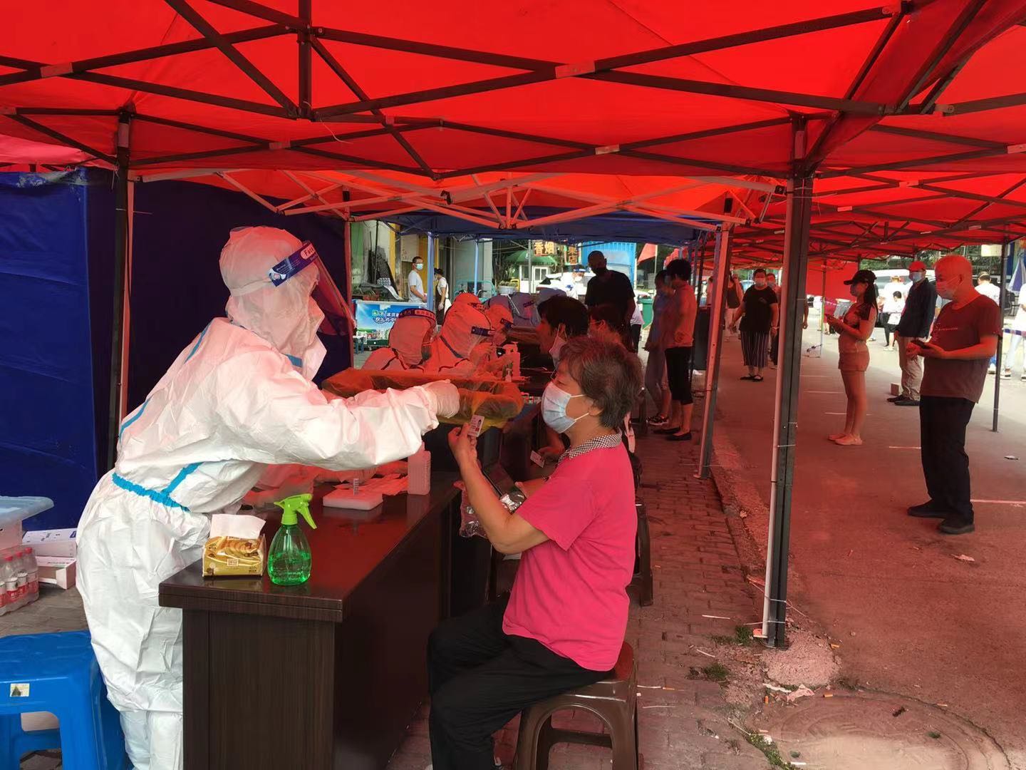 隨著時間的推延,戶外炎熱難耐,不是親身經(jīng)歷,真難以想象沖在第一線的醫(yī)護人員是怎么熬過來的。為時近幾個小時的這段艱難時光中,我好幾次覺得自己快缺氧窒息了,不過看著其他志愿者送來的降溫冰塊,給我們?nèi)韲姙⒕凭禍兀l又何嘗不是負重前行呢?在一次次鼓勵加油中,終于完成了上午的核酸檢測任務,當我脫下防護服后,衣服可以擠出水來,雙手被汗?jié)n泡的發(fā)白。同時,排隊做核酸的居民也很辛苦,個個汗流浹背,他們聽從指揮,秩序井然,有的向我們問候,“你們也辛苦了!”,心里很是感動。