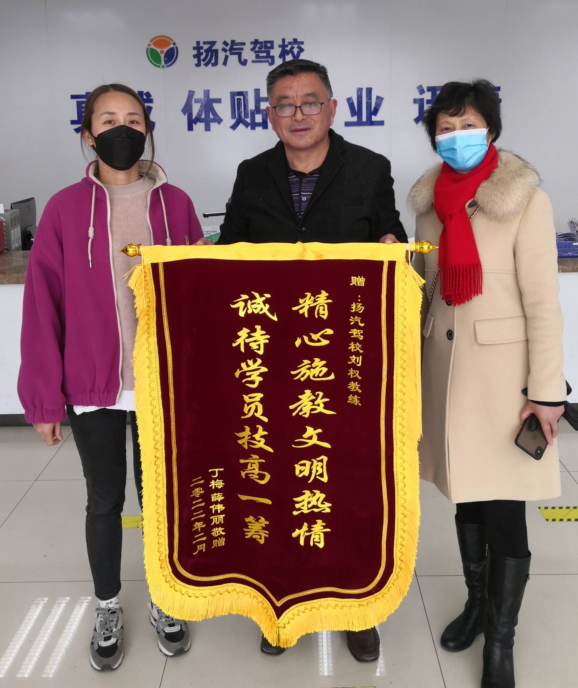 3月1日下午,揚汽駕校又收到一份禮物,剛剛順利領取駕駛證的學員丁梅、薛偉麗,將“精心施教、文明熱情、誠待學員、技高一籌”的錦旗送至揚汽駕校招生大廳,對教練劉權學車期間的辛勤付出表達深深的謝意以及對揚汽駕校的肯定。