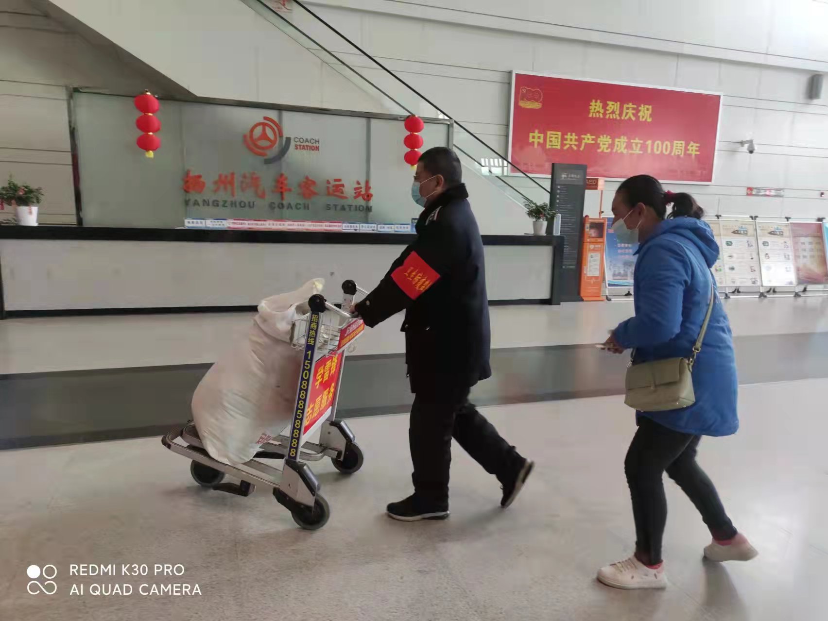 3月4日中午12點半左右,一名中年女同志拖著一個大大的尼龍袋子,一瘸一拐、極其艱難的進了揚州汽車站售票大廳門口。