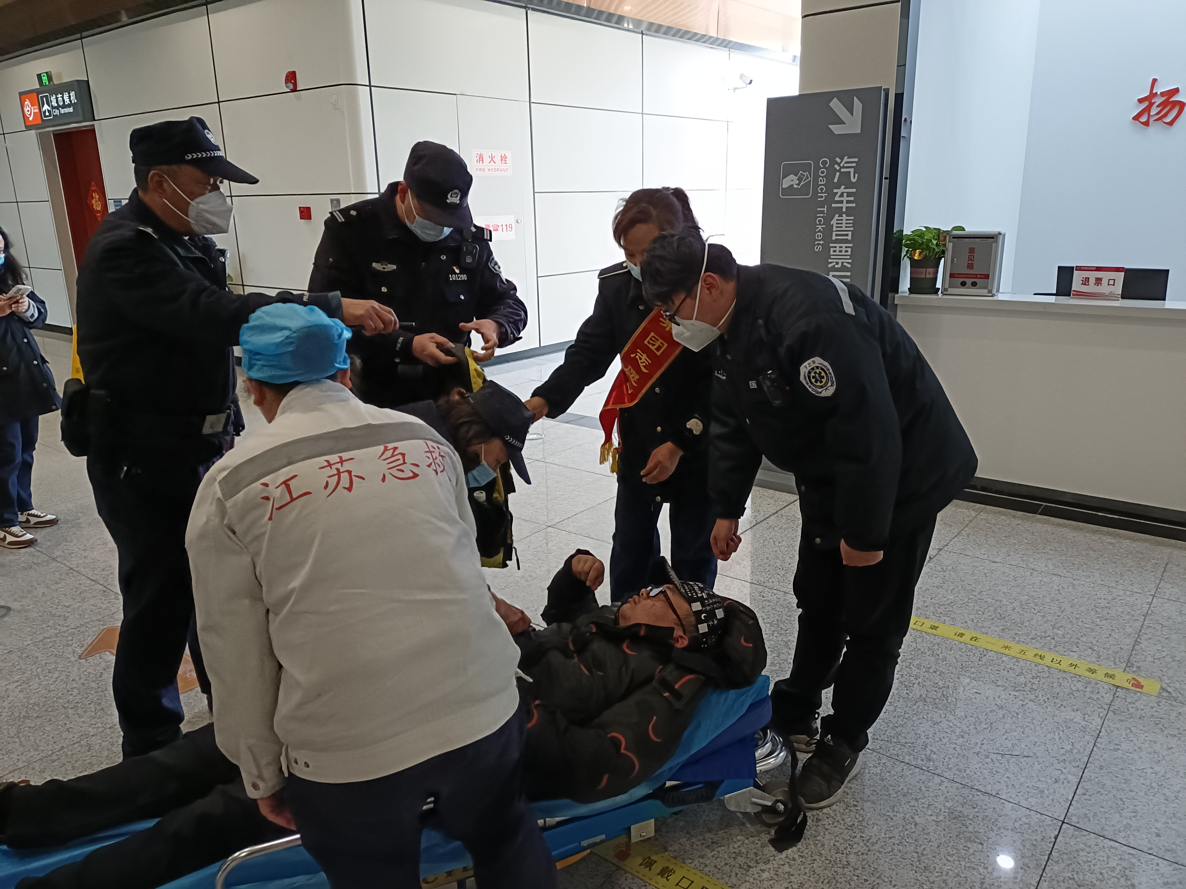 2月16日下午,揚(yáng)州東樞紐汽車(chē)站售票處,一名正在購(gòu)票的旅客突發(fā)癲癇,暈倒在地,現(xiàn)場(chǎng)工作人員及志愿者立即進(jìn)行了救助。