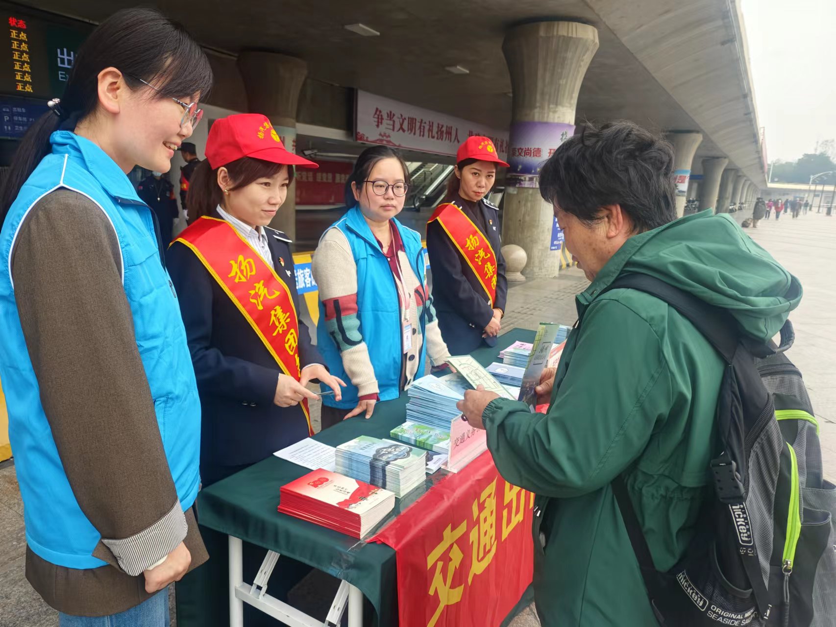 活動現(xiàn)場,志愿者們有序為旅客提供問詢指引、維持秩序、文明勸導(dǎo)等志愿服務(wù),熱情為旅客們介紹揚(yáng)州的美景、美食以及旅游線路的規(guī)劃,用熱情的服務(wù)態(tài)度和專業(yè)知識,給旅客們帶來了更好地幫助。